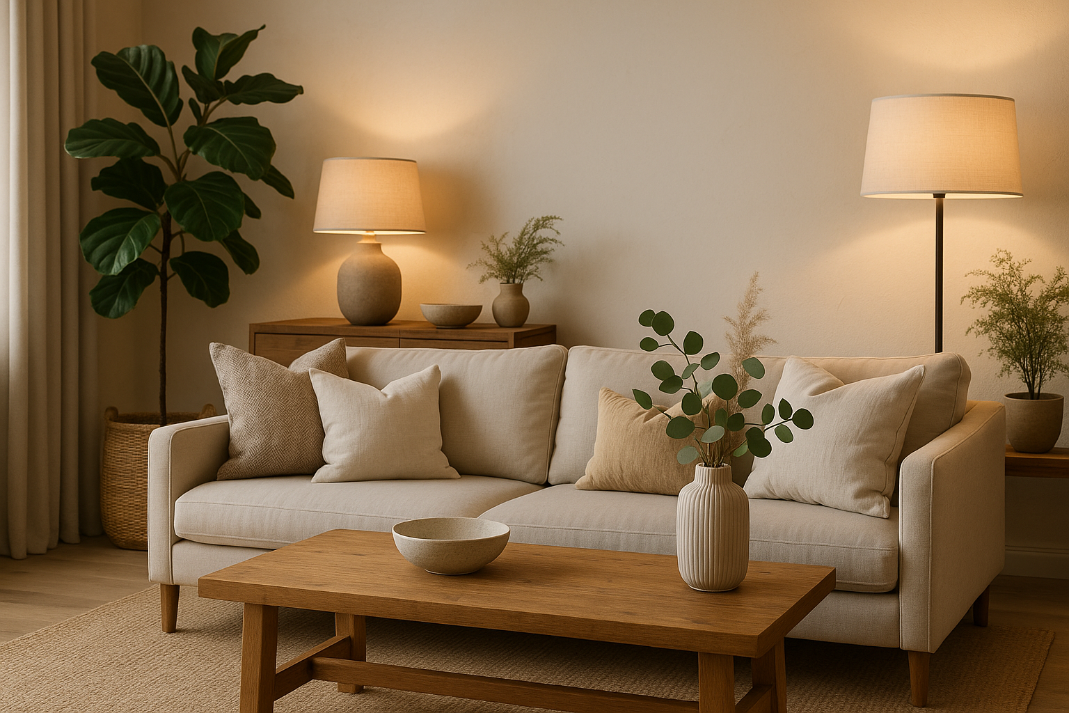 Modern entryway with natural wood bench, large ceramic vase, woven basket, and neutral rug
