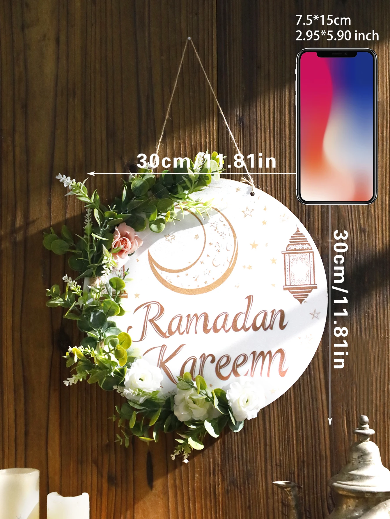 Where to use it: hang it on an entry door to greet guests with Ramadan warmth, position it above the living room doorway to frame your gatherings, or place it on a balcony or porch to create a welcoming focal point for evening conversations. Its restrained elegance also pairs beautifully with other boho home decor items, outdoor string lights, or seasonal florals for a cohesive look.