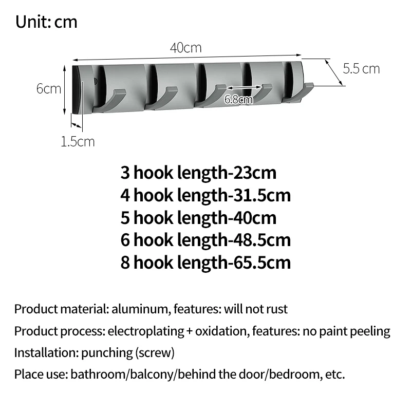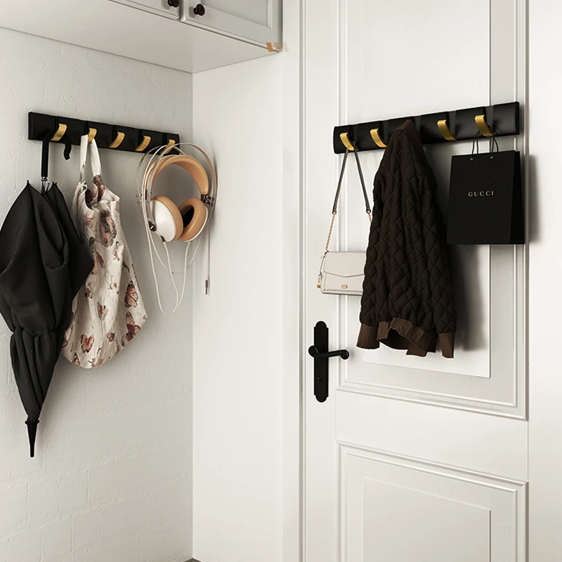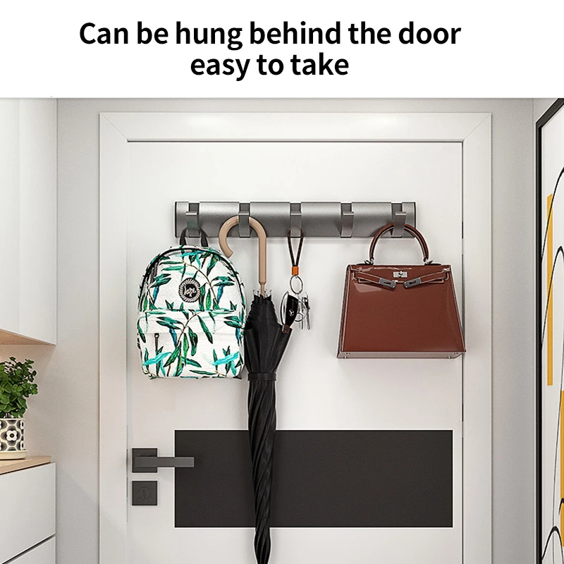 - Six durable aluminum hooks arranged in a clean, modern layout to maximize hanging capacity while preserving wall space.